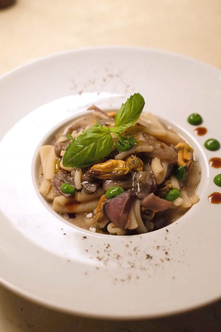 The pasta e fagioli is a very successful variation, with mussels and Treviso radicchio — the best version I’ve ever had.
