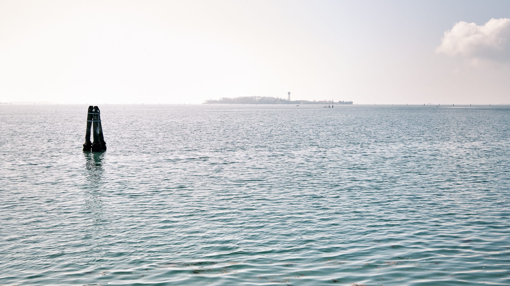 Toward the southern edge, everything opens again. A line of benches faces the lagoon. The view is wide and low, reaching the islands—Sacca Sessola and Isola delle Rose—almost flat in the distance. There is a small structure, like an open theatre, quiet and empty.